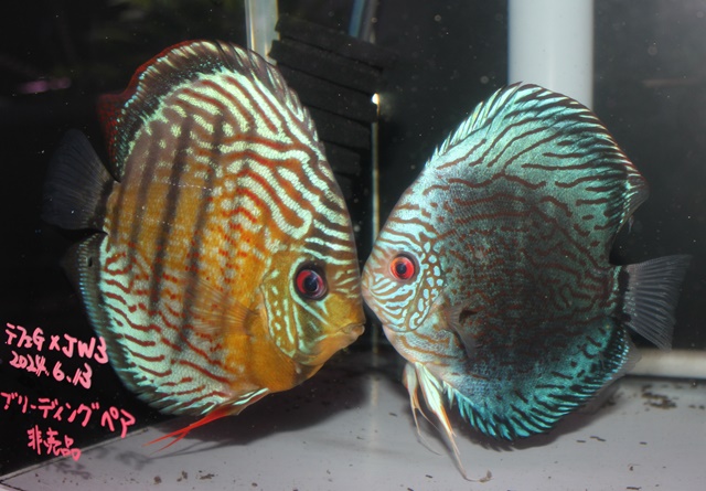 餌はアクアマイスターオリジナルディスカスハンバーグ(スピルリナ・ガーリック)とベンリーパック食品の冷凍赤虫を与えております。